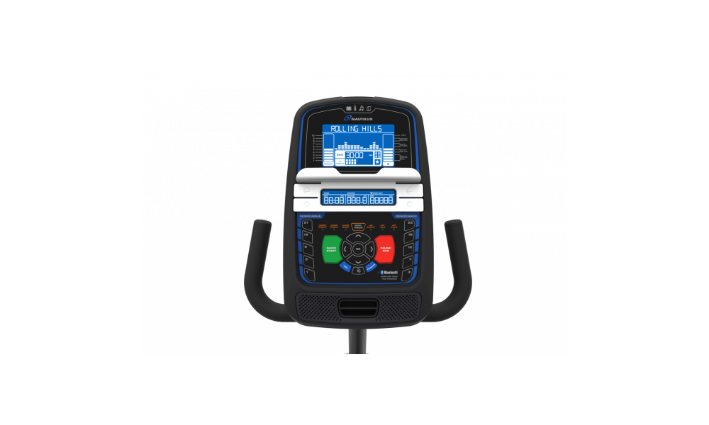 Сидение тренажера имеет вентилируемую конструкцию и оборудовано рельсовой системой регулировки по высоте и расстоянию от педалей. Число предустановленных программ: 29 (9 встроенных профилей, 8 программ контроля частоты сердечных сокращений, 2 пользовательских профиля, 2 фитнес-теста, быстрый старт). Консоль в режиме реального времени отражает такую информацию о тренировке, как продолжительность занятий, дистанция, скорость, количество сожженных калорий и многое другое. Эти данные можно экспортировать в сервисы Nautilus Connect и MyFitnessPal через Bluetooth. Дисплей: сдвоенный ЖК-дисплей DualTrack с яркой синей подсветкой.