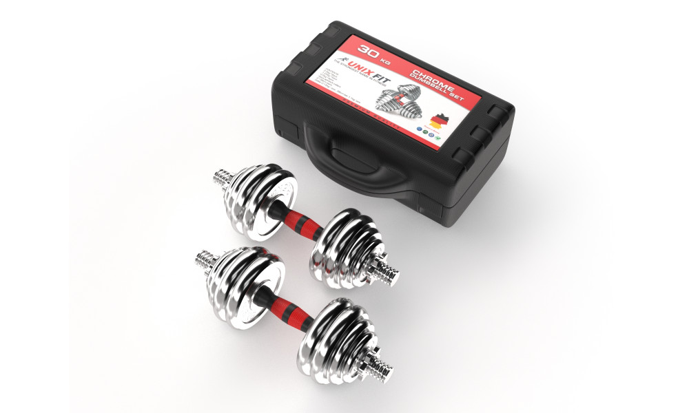 Набор состоит из двух гантелей общим весом 30 кг. Удобная разборная конструкция позволяет регулировать вес гантелей в процессе занятий, а эргономичная рукоятка сделает тренировку комфортной. В комплект входит компактный кейс для хранения и транспортировки гантелей.