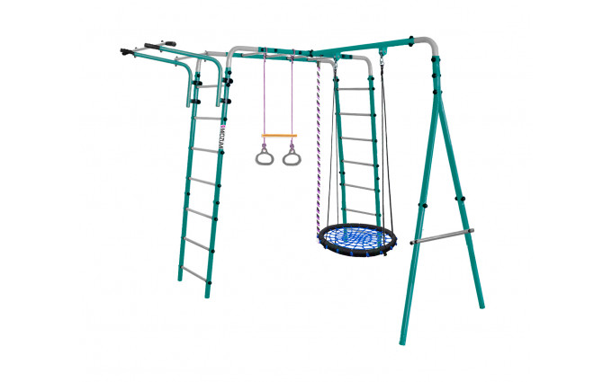 — Комплектация: каркас из металлических лестниц с рукоходом, турник, качели гнездо, канат, кольца с перекладиной.